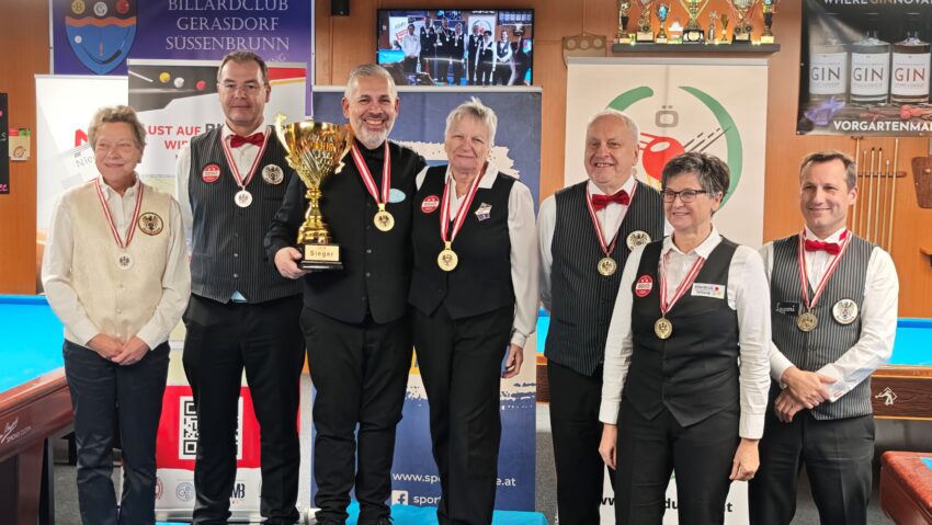 Die Medaillengewinner:innen der ÖSTM Dreiband am MAtchbillard 2025/26 v.l.n.r. Helga Mitterböck (2.), Claus Maurer (2.), Alexander Weiss (1.), Ingrid Englbrecht (1.), Karl Makik (3.), Monika Steinberger (3.), Arnim Kahofer (3.) – Foto (c) Ken Dahlke