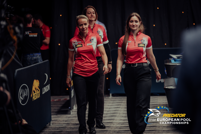 Jasmin Ouschan, Sandra Baumgartner und Lena Primus am Weg zur Siegerehrung des Teambewerbs der 46. Poolbillard-Europameisterachaft in Antalya – Foto (c) probilliardseries