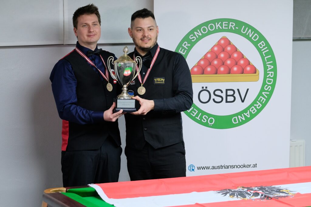 12.01.2026. Beim erstmals ausgetragenen „Finals“-Event des Österreichischen Snooker- und Billiardsverband (ÖSBV) im Bundesleistungszentrum (BLZ) in Wien-Hütteldorf haben sich gestern am abschließenden zweiten Wettkampftag mit dem Wien/Niederösterreich-Duo Thomas Janzso/Jérôme Liedtke, dem Oberösterreicher Lukas Stötzer und dem Niederösterreicher Hans Nirnberger die Titelverteidiger in den Snooker-Kategorien Doppel, U21 und Masters (über 40) durchgesetzt.